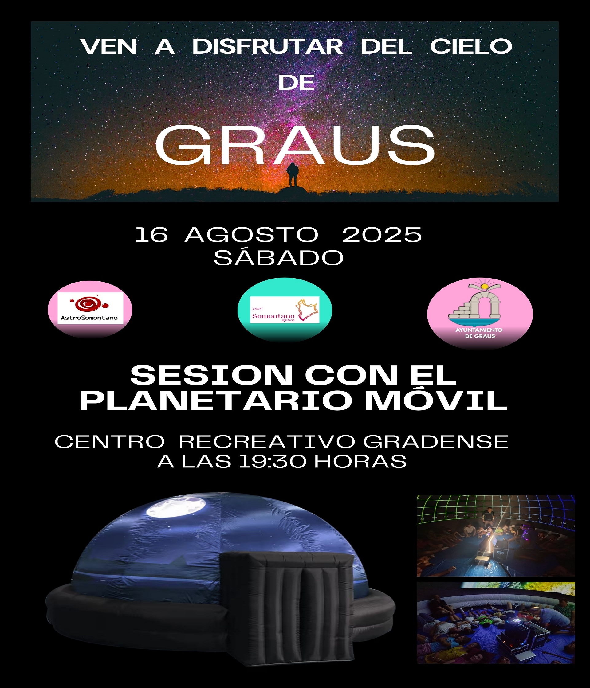 El sábado día 16 de Agosto instalaremos en el Centro Recreativo Gradense el Planetario de la Comarca del Somontano. Estás invitado a asistir a un espectáculo audiovisual especial.